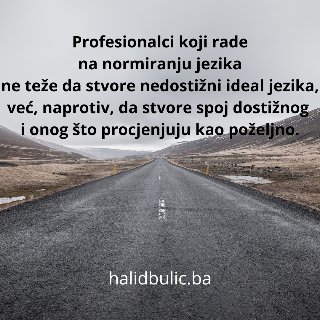 Ranije sam pisao da se normativne preporuke zasnivaju na nekoj vrsti vrijednosnog suda, a vrijednosni sud u principu nije naučni sud. Međutim, standardni jezik je jedan oblik jezika, a jezik je sistem, tako da i standardni jezik treba biti sistem – uređeni skup jedinica među kojima su odnosi jasni. Doduše, standardni jezik je autonoman oblik jezika. Nakon što se definira, on, bar u teoriji, može biti nezavisan od jezika kao organskog idioma, “živog” komunikacijskog jezika. Međutim, profesionalci koji rade na normiranju jezika ne teže da stvore nedostižni ideal jezika, već, naprotiv, da stvore spoj dostižnog i onog što procjenjuju kao poželjno. Šta je dostižno, a šta je poželjno u standardnom jeziku?